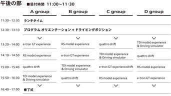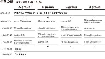 Audi Expertから、この3つの新しいエンジンのご説明と、そのハイパフォーマンスをご体感いただけるサーキット走行プログラムです。